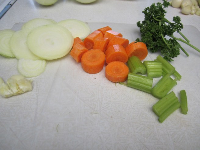 Hachis Parmentier is essentially Shepherd’s Pie, but much, much richer. I had an elk roast that I’d set aside for this recipe and combined it with some organic beef stewing meat. I looked for gluten-free sausages and finally found some smoked Bison that fit the bill. I had to mince the sausages for the recipe, as they were not crumbly, but they were tastily worth it. Boiling the meat with the vegetables produces a thin, but delicious broth. As a bonus, I was left with enough broth after making the dish, that I was able to freeze two ice cube trays’ worth.