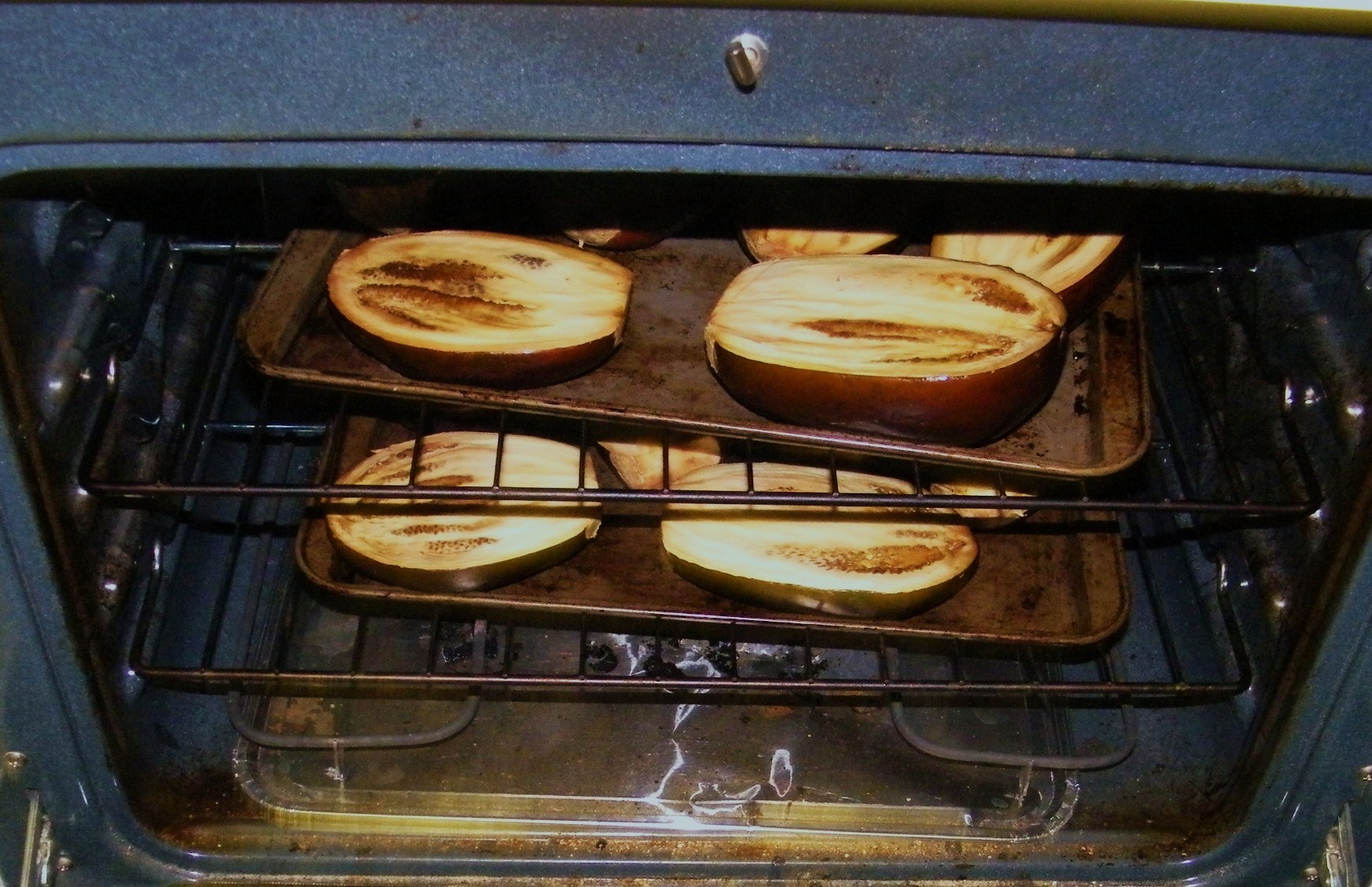 That’s not something I’d usually do, as I have a very small freezer. But, our housing co-op had a soup swap this past Saturday, so quadruple I did. I made Smitten Kitchen’s Roasted Eggplant Soup, which caused me to fill the kitchen counters with smashed garlic cloves and halved eggplants, tomatoes and onions. Thank goodness the recipe didn’t call for any chopping. I roasted the vegetables in shifts, then worked the roasted eggplant free of its skin and plucked off the leaves of the tomatoes. I split the ingredients into two pots, added the stock and the seasonings and then was finally able to let the soup cook itself down. While I started on the dishes.