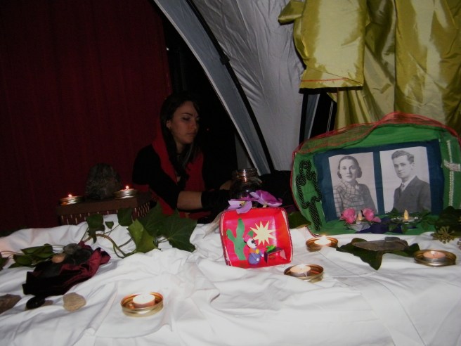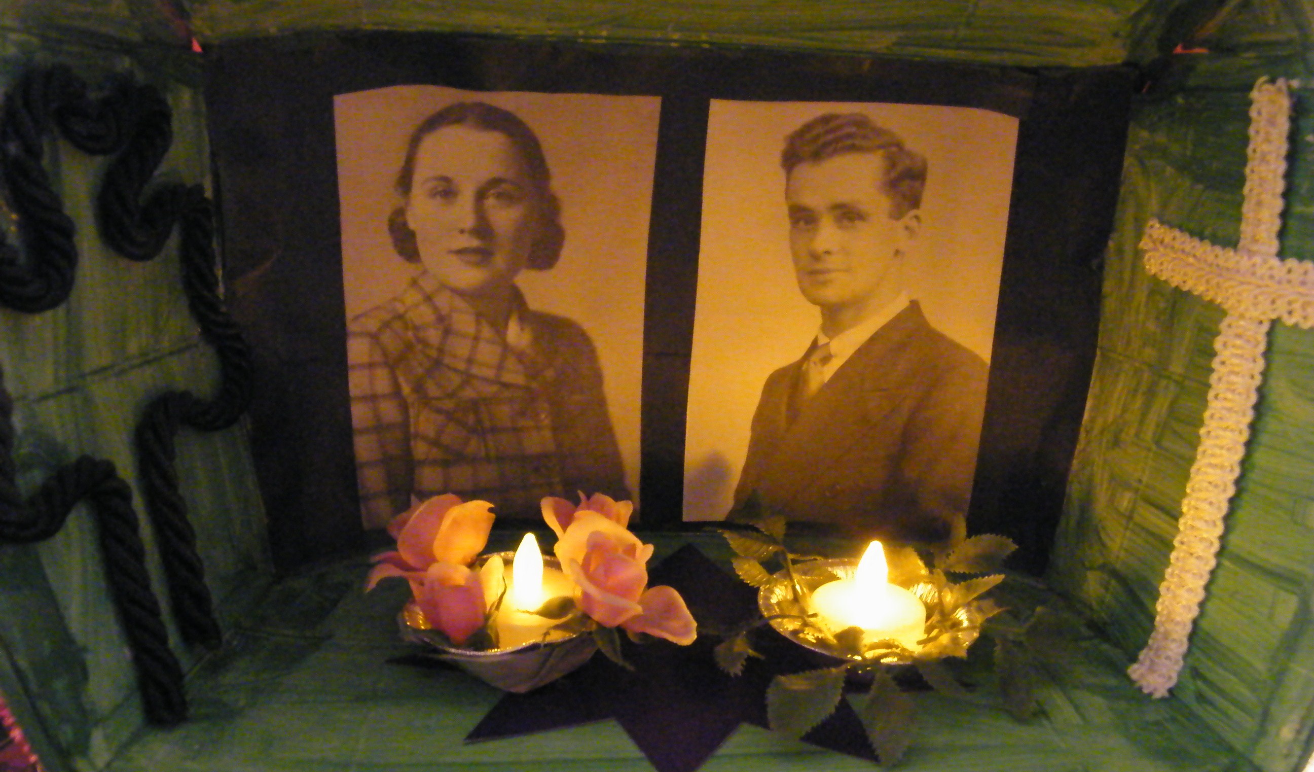 I brought the shrine, along with a small Mexican-themed one that I’d made, to the starting point of the Secret Souls walk on Saturday. One of the volunteers at the shrine station told me later that everyone who came by wanted to know about my grandparents and their story. I really want to thank Public Dreams for the opportunity; it’s a very meaningful process and it’s wonderfully healing to honour one’s dead.