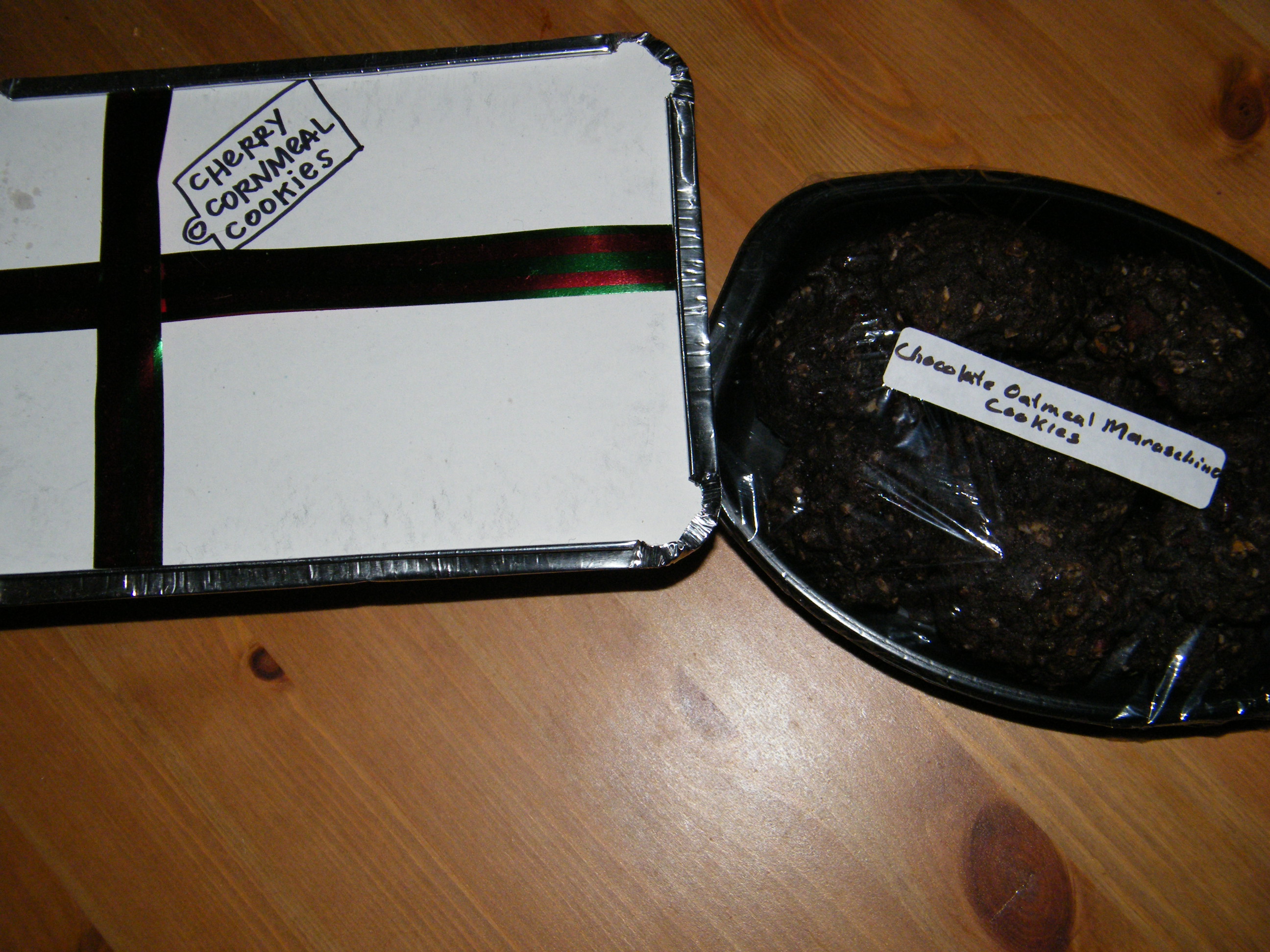I only needed two dozen cookies for the swap, so I packaged them quickly (using an image I’d found online for the tags) and headed for the Market. I dropped off my cookies and did some shopping while I waited for the swap to begin. Cleverly, the organizer had set up paper bags with participants’ names on them and put our cookies inside. Since we’d all brought two packages of a dozen cookies, we couldn’t have a sample of each kind. Instead, we were invited to pick two bags, making sure they didn’t have our own names on them. I love the grab bag concept. I was pleased to find myself in possession of Roberta LaQuaglia’s Cherry Cornmeal Cookies and Jennifer Zuk’s Chocolate Oatmeal Maraschino Cookies. I’ve tasted them both and can attest that they are delicious. The rest are earmarked for holiday celebrations. Thanks to Robyn Carlson of the Market for organizing the swap – I’m already looking forward to next year’s!