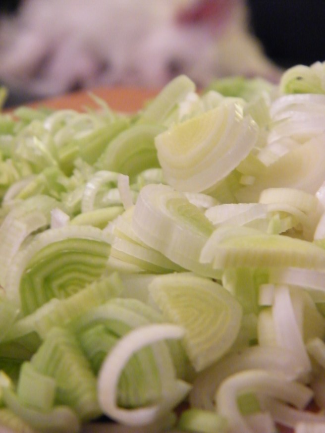 It’s been cold, blustery and wet for the most part lately, so it’s fitting that this week’s post features a warm and comforting soup. It’s also a versatile soup – the full title of this recipe is Leek and Potato Soup, Smooth or Chunky, Hot or Cold. Dorie gives a number of suggestions for variations and this soup could easily act as a base for many more. I chose to try one of the variations and added a handful of shredded spinach to mine near the end of the cooking time. Then, I partially pureed the soup and served it hot.