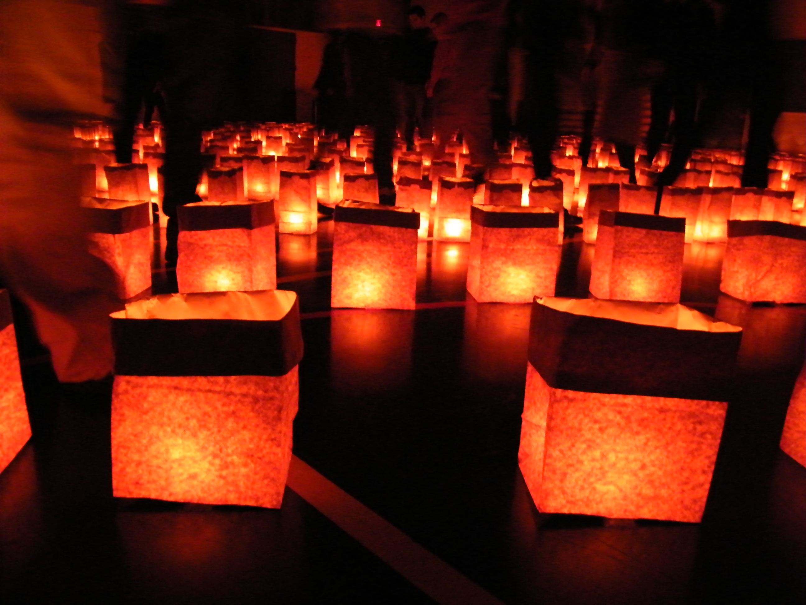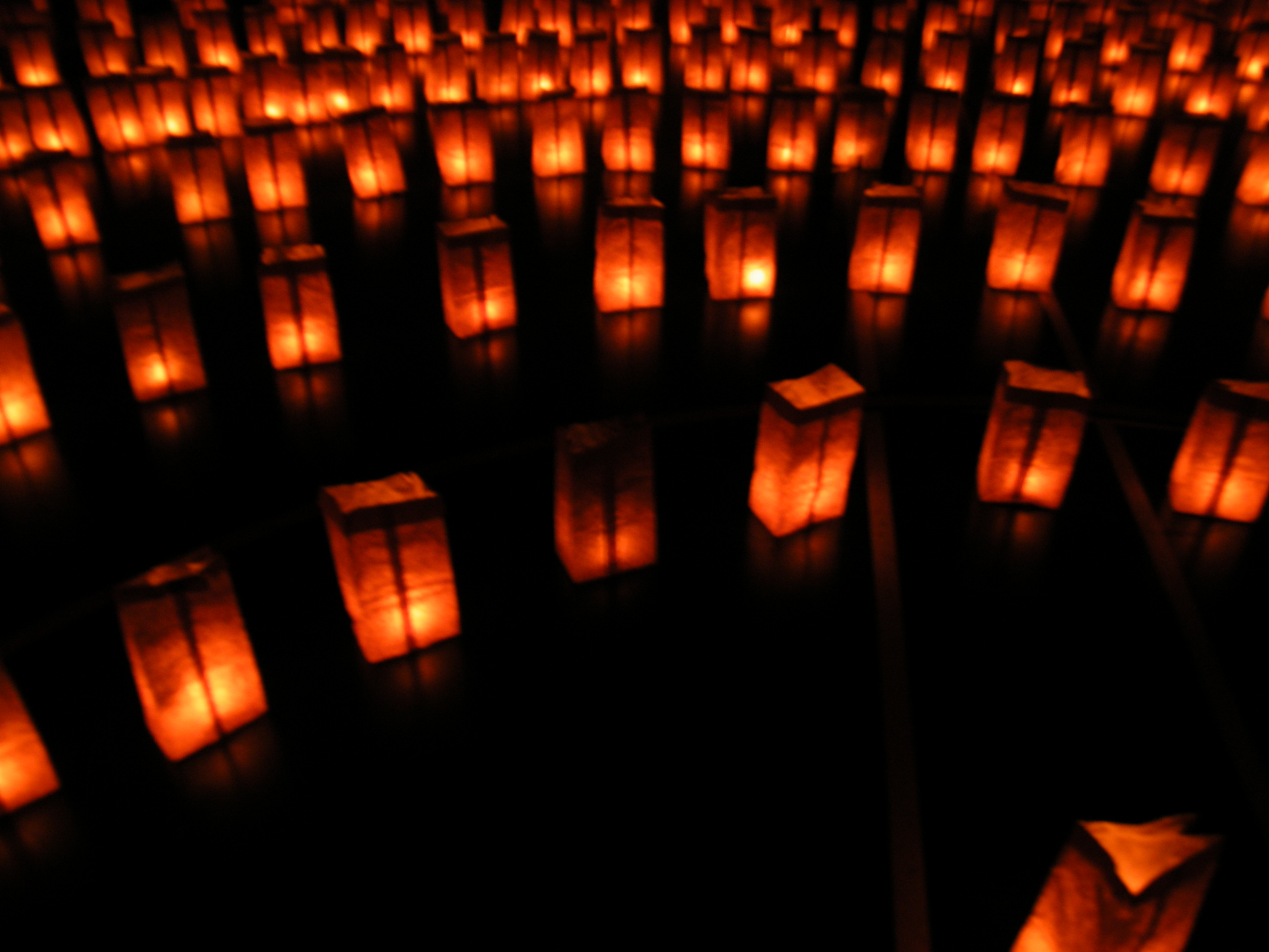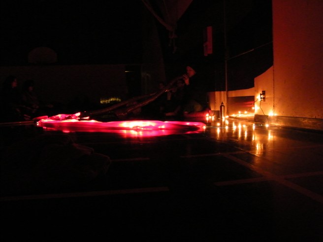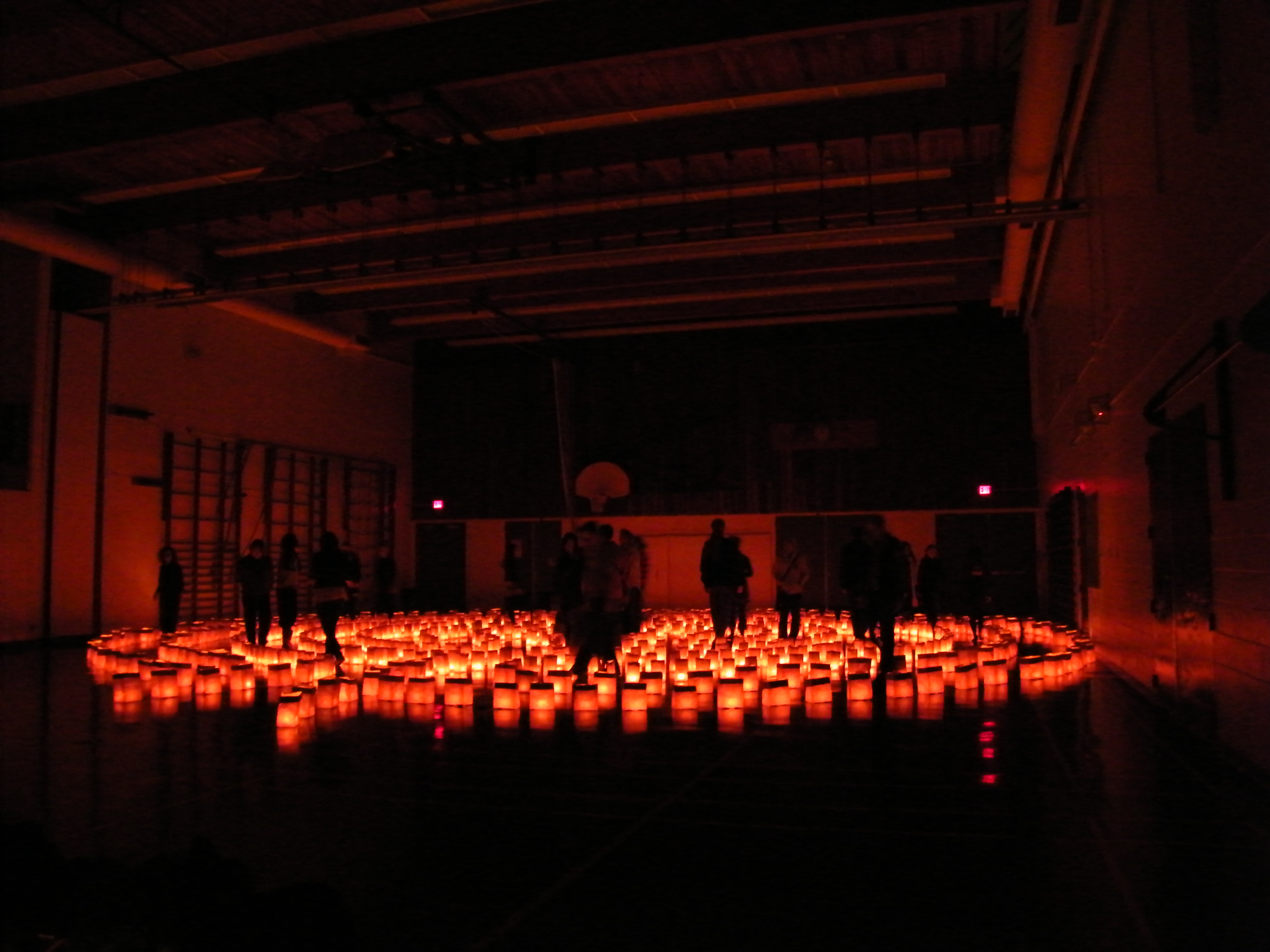 Walking the labyrinth meant negotiating the narrow spaces defined by the paper sacks which held the candles providing most of the room’s light. The way into a labyrinth is also the way out, so polite shuffling became a part of the experience. The design led you far inside and then back to the outer edges of the labyrinth again and again before you truly reached the centre. Then, after some contemplation, it was time to wind slowly out again. The heat from the candles, the music and the darkness helped to create a solemn atmosphere, but many people moved through the labyrinth with joy and one young woman danced back and forth through its passages.