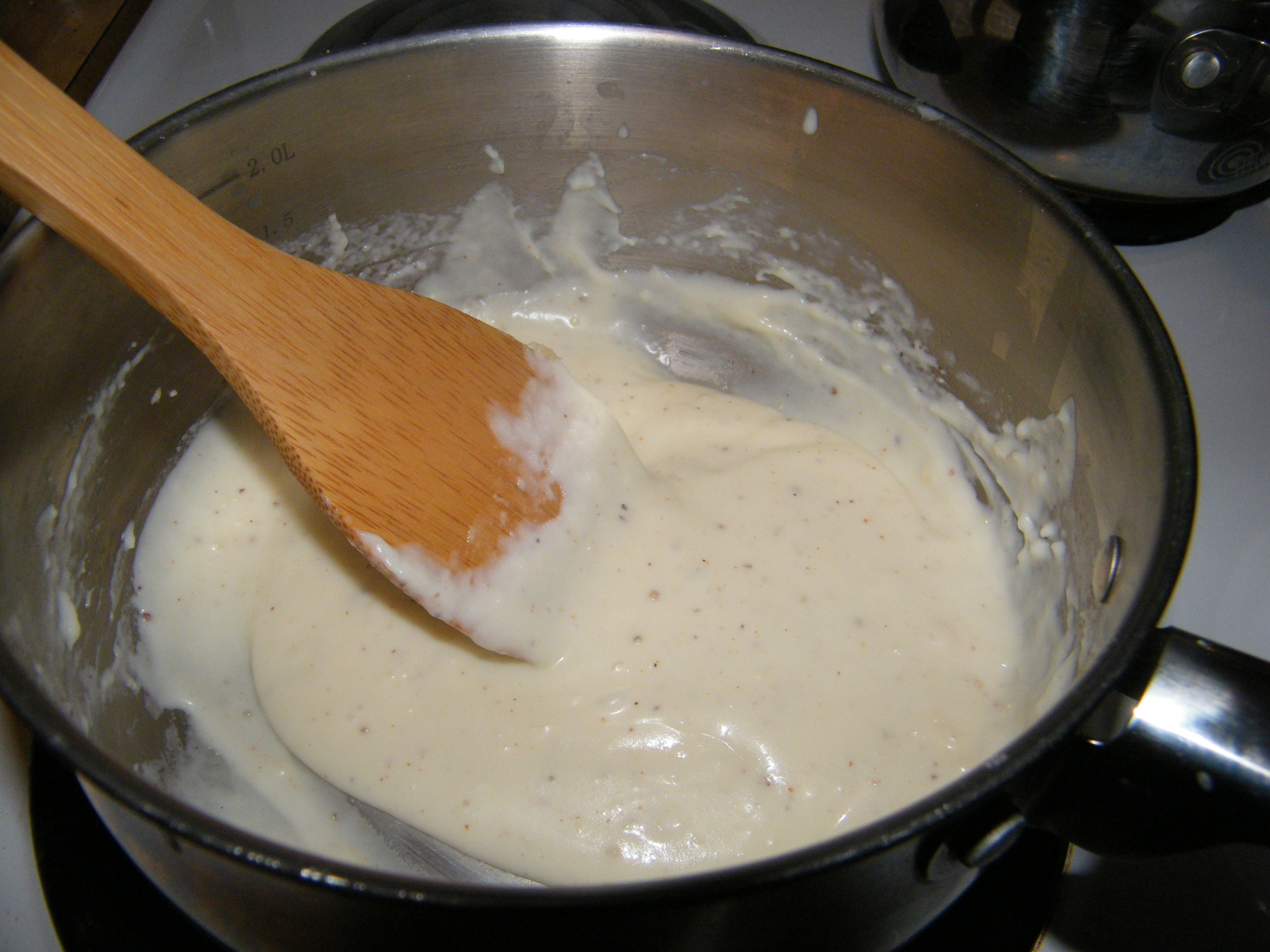 Considerably less effort was needed to make this week’s recipe, Gnocchi à la Parisienne. Since it’s made of pâte à choux instead of potato-based dough, a stand mixer takes most of the work out of making this dish. Shaping the gnocchi also took very little time, as they’re dropped by the teaspoonful. I chose to freeze most of mine and let the balance of the dough rest while I made the béchamel sauce.