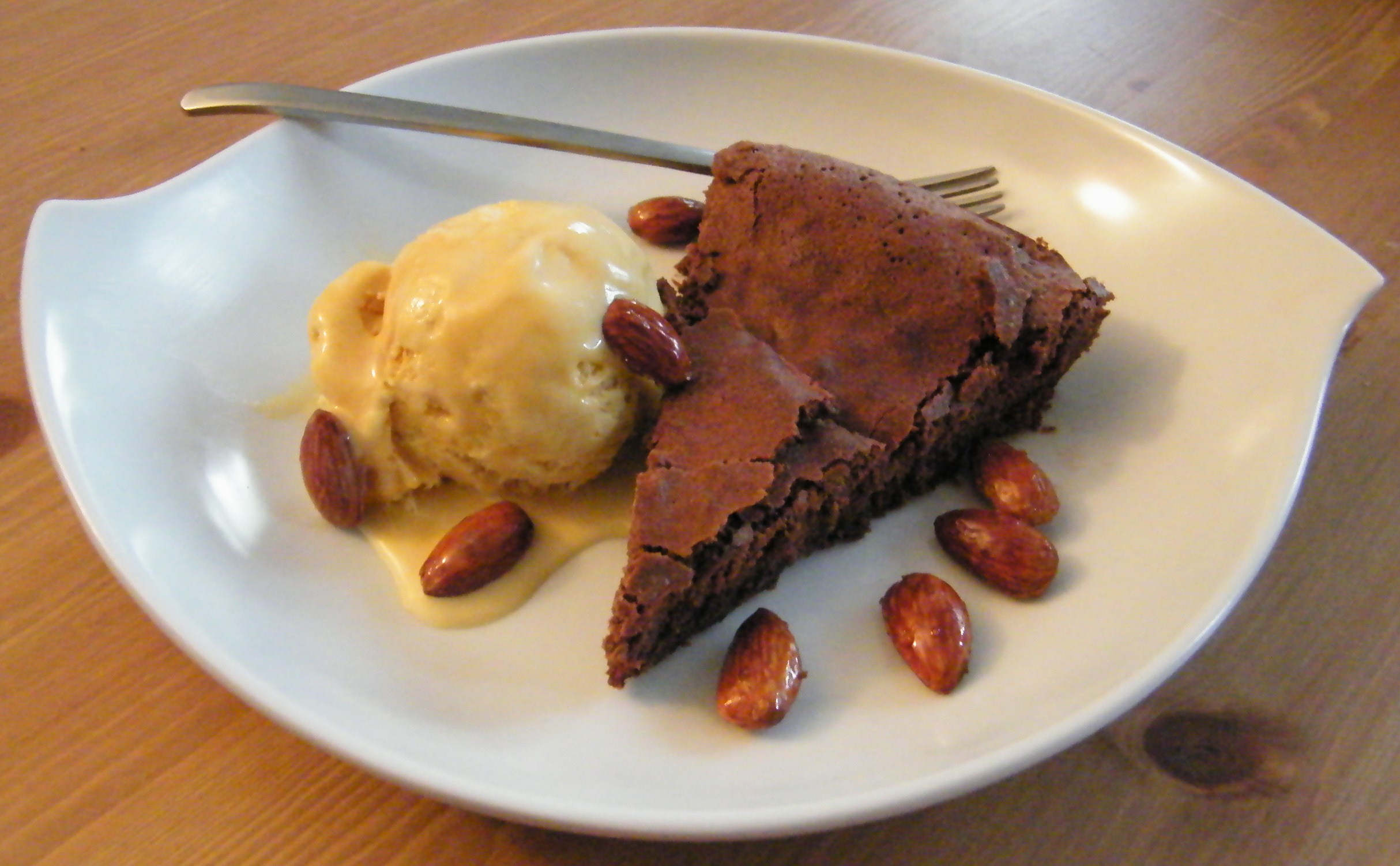 It’s safe to say that I’m enjoying cooking from Around My French Table. Learning from Dorie Greenspan and from each other, the group has made some delicious dishes so far. This week’s recipe has inspired me to do a little learning beyond the AMFT classroom. Since the double chocolate mousse cake almost cries out for ice cream, I pulled out my (brand new) copy of David Lebovitz’ Ready for Dessert and looked for a suitable match. I don’t have an ice cream freezer, but that wasn’t too much of a barrier. I used his frozen caramel mousse recipe, along with salted almonds (both of which are meant to be served with sherry-glazed pears and chocolate, but those will have to wait for another time).