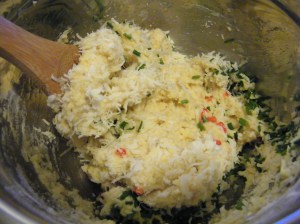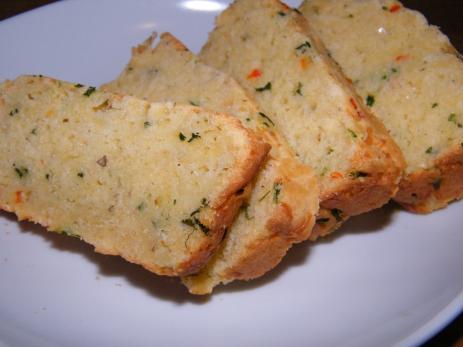 I’ve actually made this recipe twice. The first time, back in October when I first got Around My French Table, I made it with standard flour and a sharp, good cheddar cheese. I was at my parents’ house and baked it for them to use for lunches. I didn’t have the opportunity to taste it, but I heard that everyone enjoyed it. This week, I made it with a gluten-free all purpose flour and used Gruyère. I also added some tiny cubes of red pepper along with the chives. (Before I added the peppers to the mixture, I dried them out a little in a skillet over low heat on the stovetop.) Gluten-free breads can often have a very dry and crumbly texture, but not so for this bread. Though it was a little denser than the standard flour version, it was very moist and not at all gritty. I think this would be a good recipe to use a g-f flour mix that has teff in it, which might make the texture a little closer to the standard flour version. I’m also looking forward to trying some of Dorie’s bonnes idées for this recipe – it lends itself to a lot of variation.