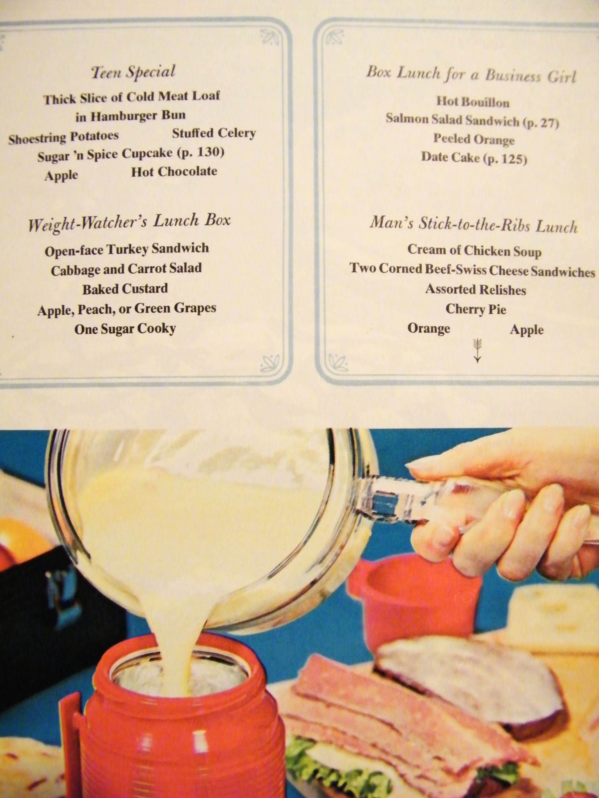 1. Thanks, Karen! The Business Girl lunch menu never fails to make me laugh, especially when you contrast it with the Man’s Stick-to-the-Ribs menu.