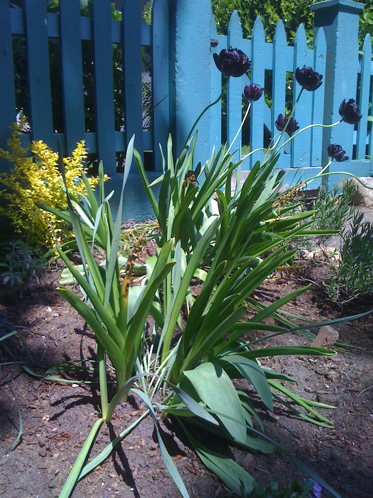 Frilly, dark purple tulips with long, curvy stems against a green fence, with yellow flowers in the background and a mixture of shadows and light.