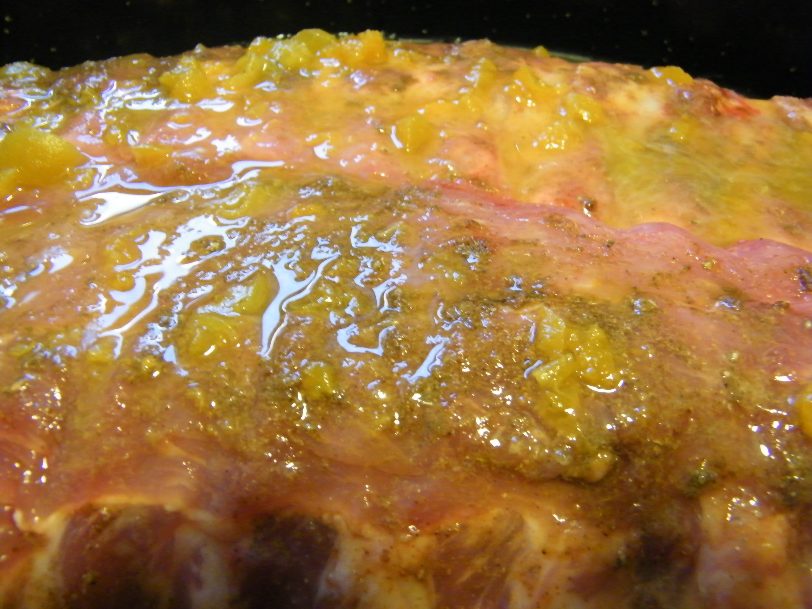 Ribs ready to go in the oven. You can see the jamminess of the marinade.