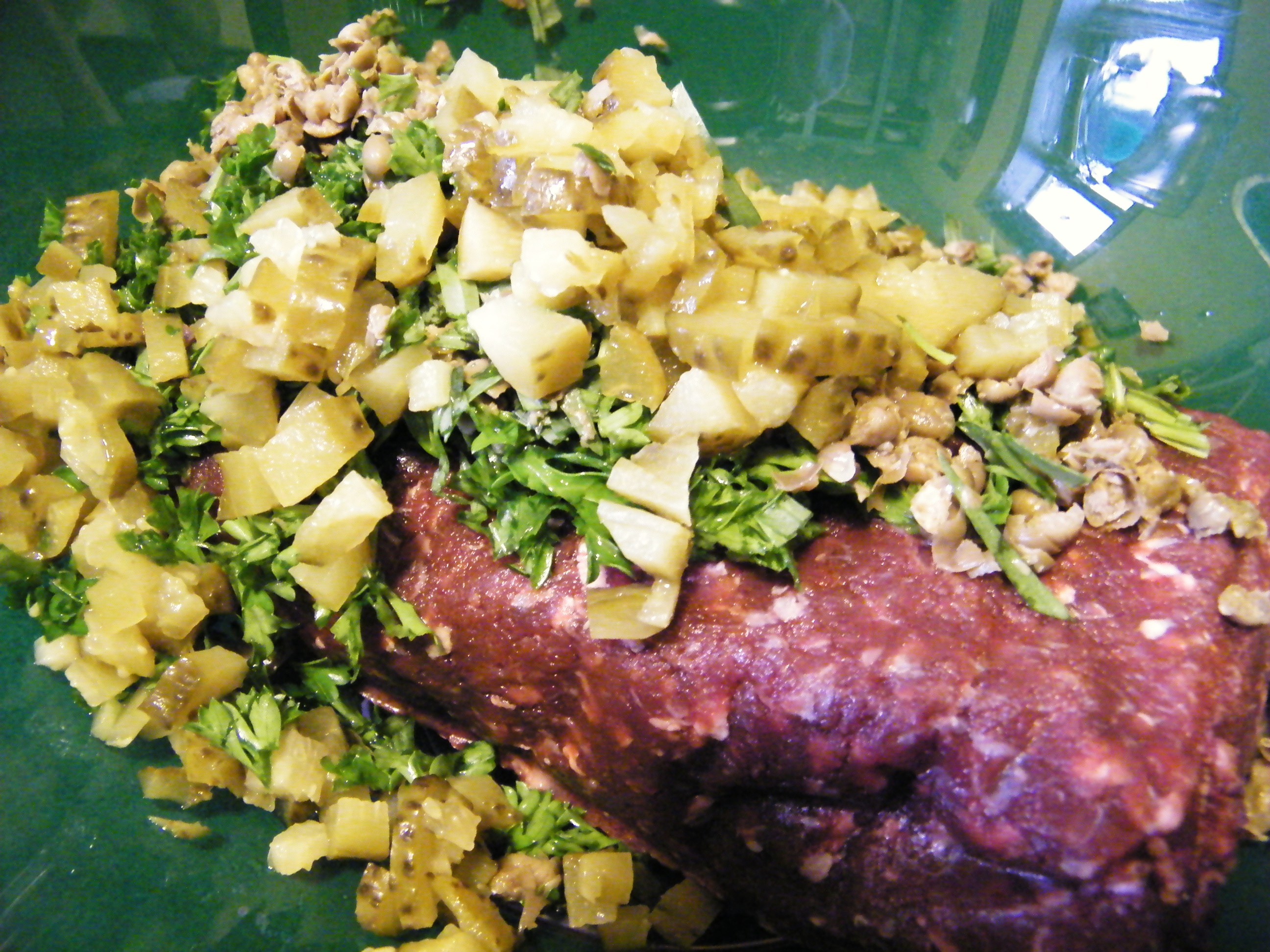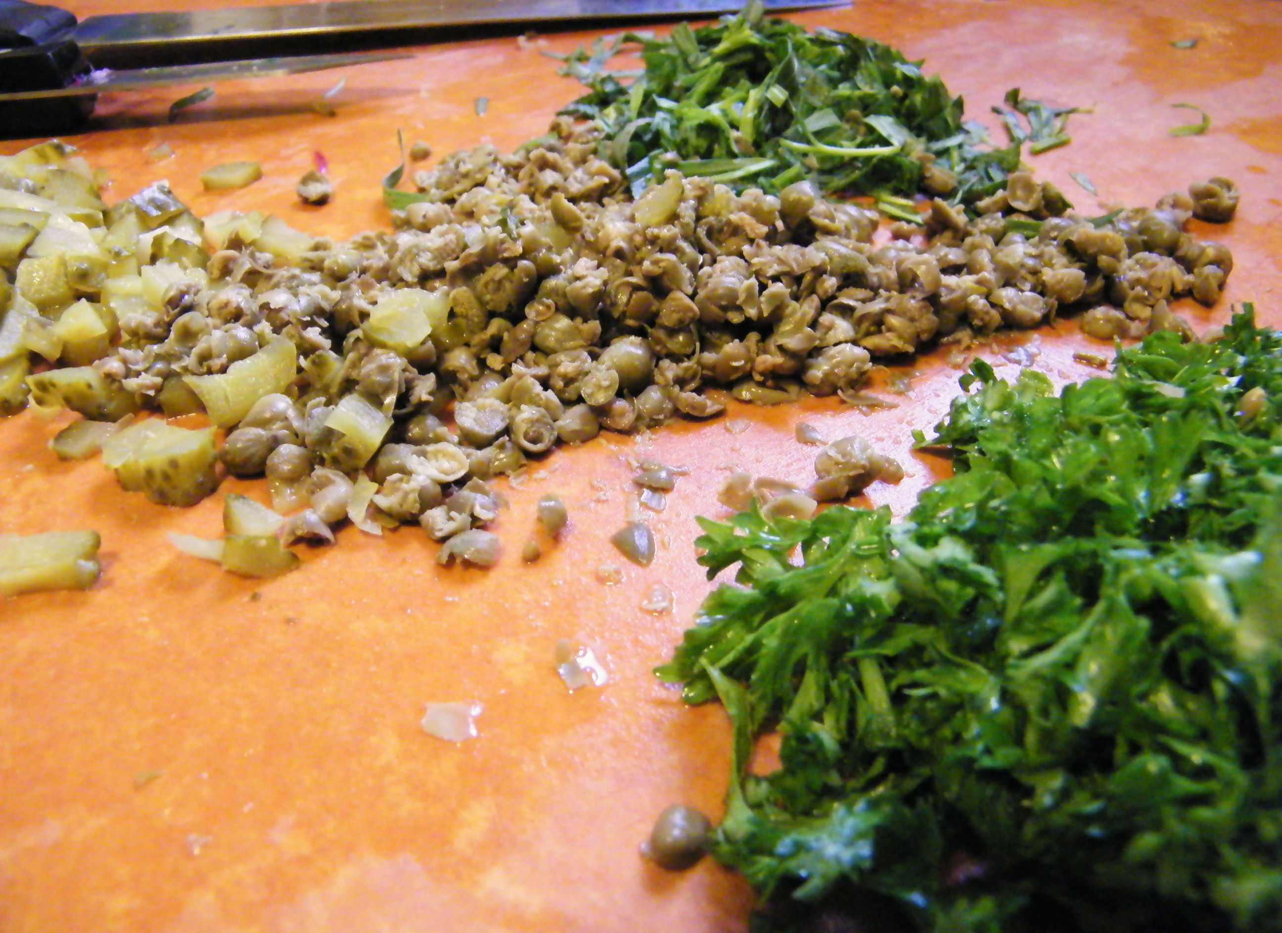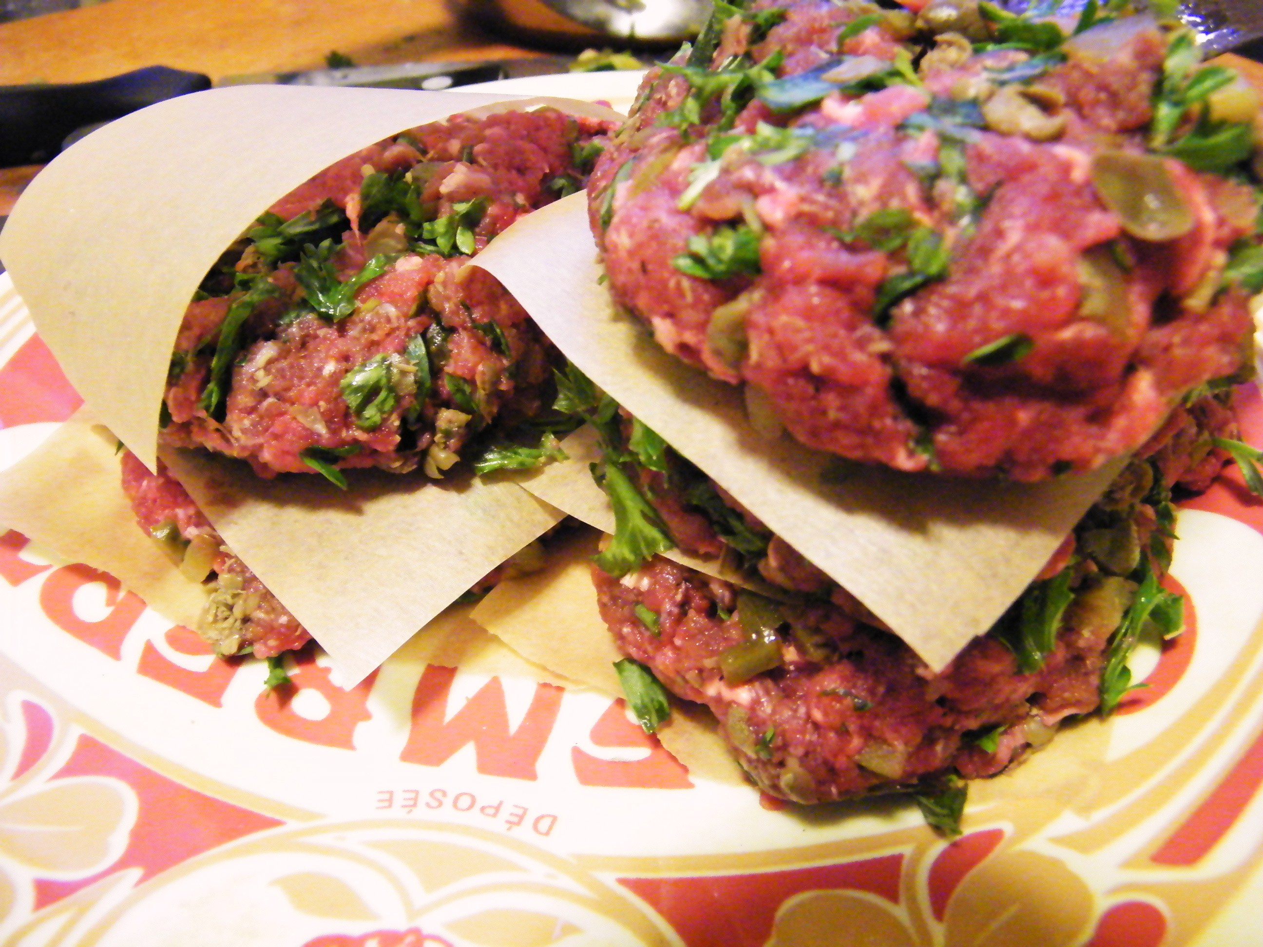 The recipe calls for tarragon, parsley, capers, and cornichons (small, crunchy, cucumber pickles) to be chopped up and mixed with the meat. Sun-dried tomatoes are also called for, but I skipped those this time. I ground some pepper into the mixture, but omitted salt, as I thought the cornichons and capers would make the burgers more than salty enough for us.