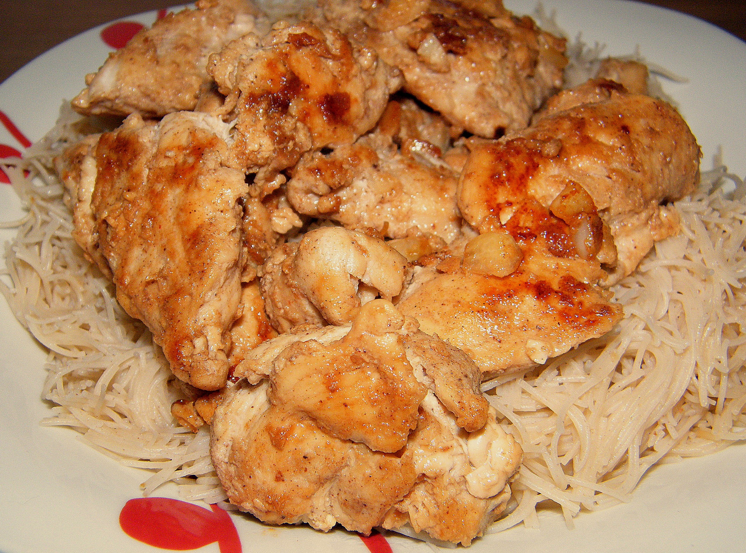 No matter. As Doristas like to say, French Fridays recipes are as much jumping off points as they are road maps. The cinnamon put me in mind of Moroccan flavours, so I marinated slices of chicken breast in safflower oil, lemon juice, cinnamon, sugar, cumin, paprika, and garlic. I left the chicken in the marinade for a couple of hours, then sautéed it in a little chicken stock. Meanwhile, I softened some brown rice vermicelli in hot water. When the chicken was done, I added a little more lemon juice to the pan and gave it a good stir. Then, I fried the vermicelli in the pan juices. Quinoa would have been a closer match for the traditional (and gluten-y) couscous, but I fancied the vermicelli tonight.