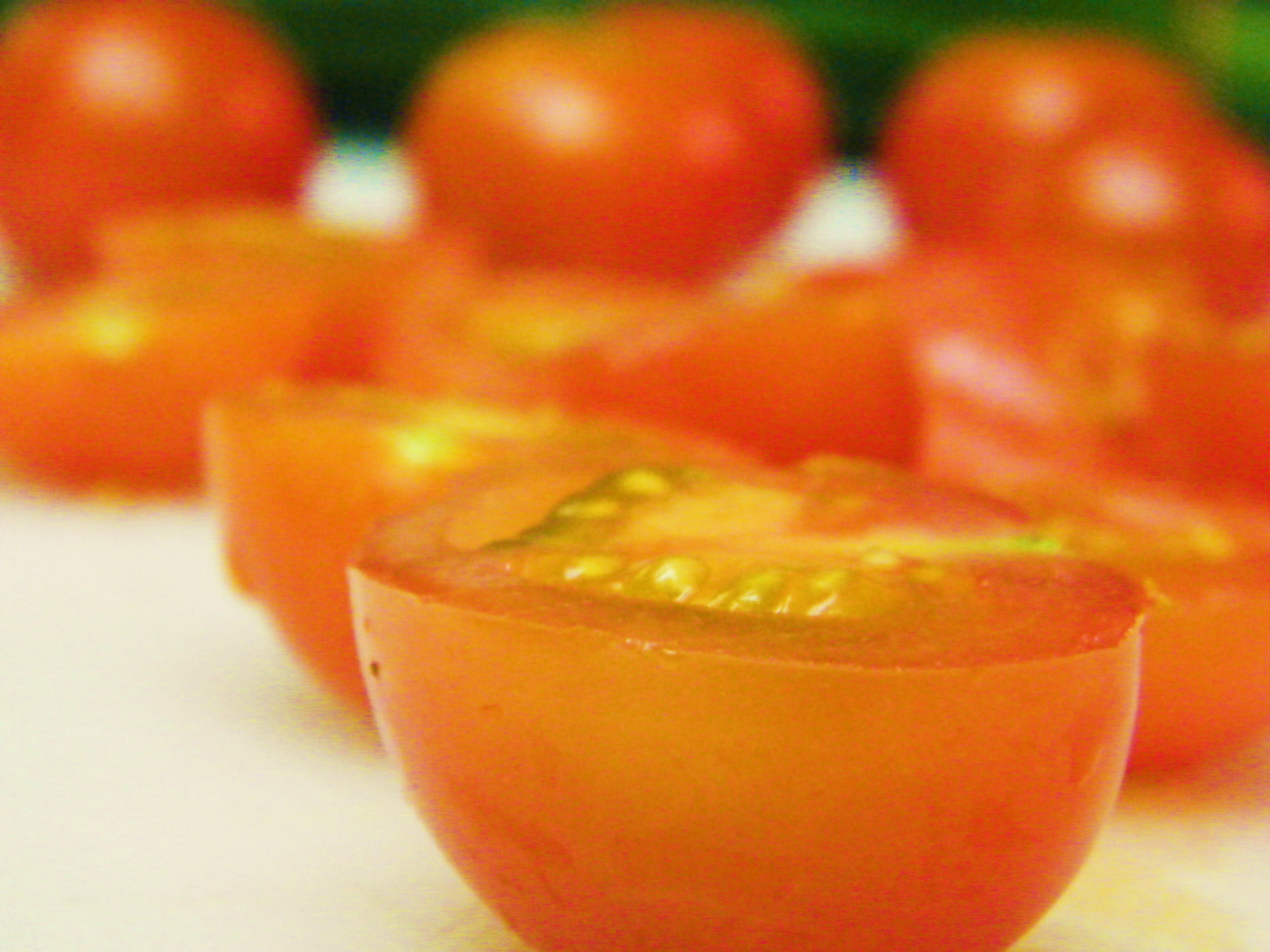 Cherry tomatoes from my mother's garden, halved and whole.