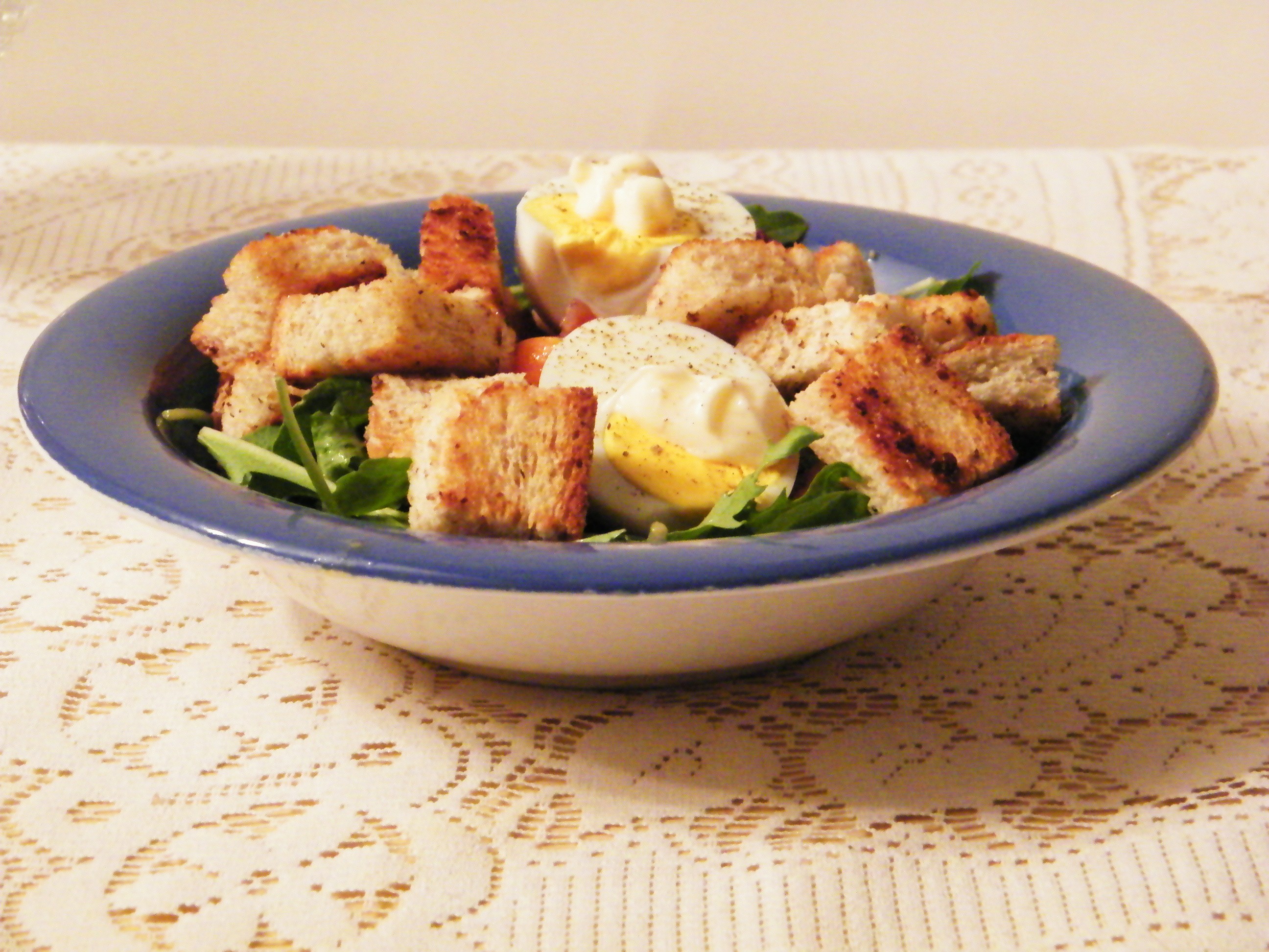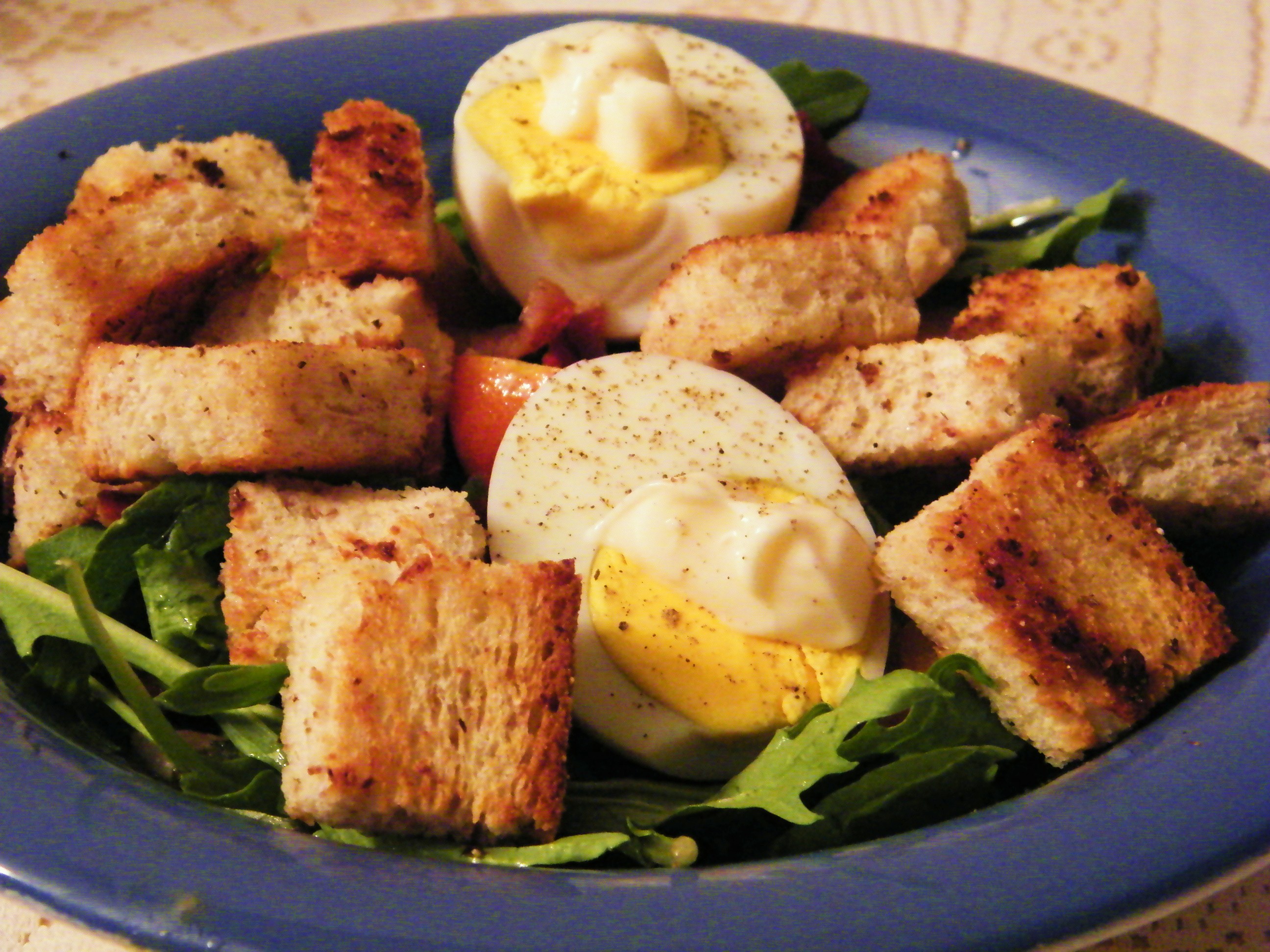 The finished salad, with greens on the bottom and bacon, croutons and mayonnaise-dolloped eggs on top.