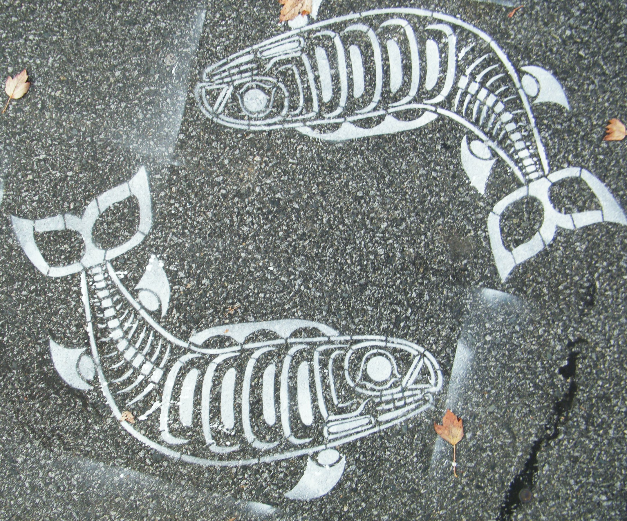 The photo at the top of this post is of some graffiti on a road not far from where I live. It reminds me of lost salmon streams and of the peoples who lived here before the pavement. They’re still here and the land I’m standing on is part of their still unceded territories.