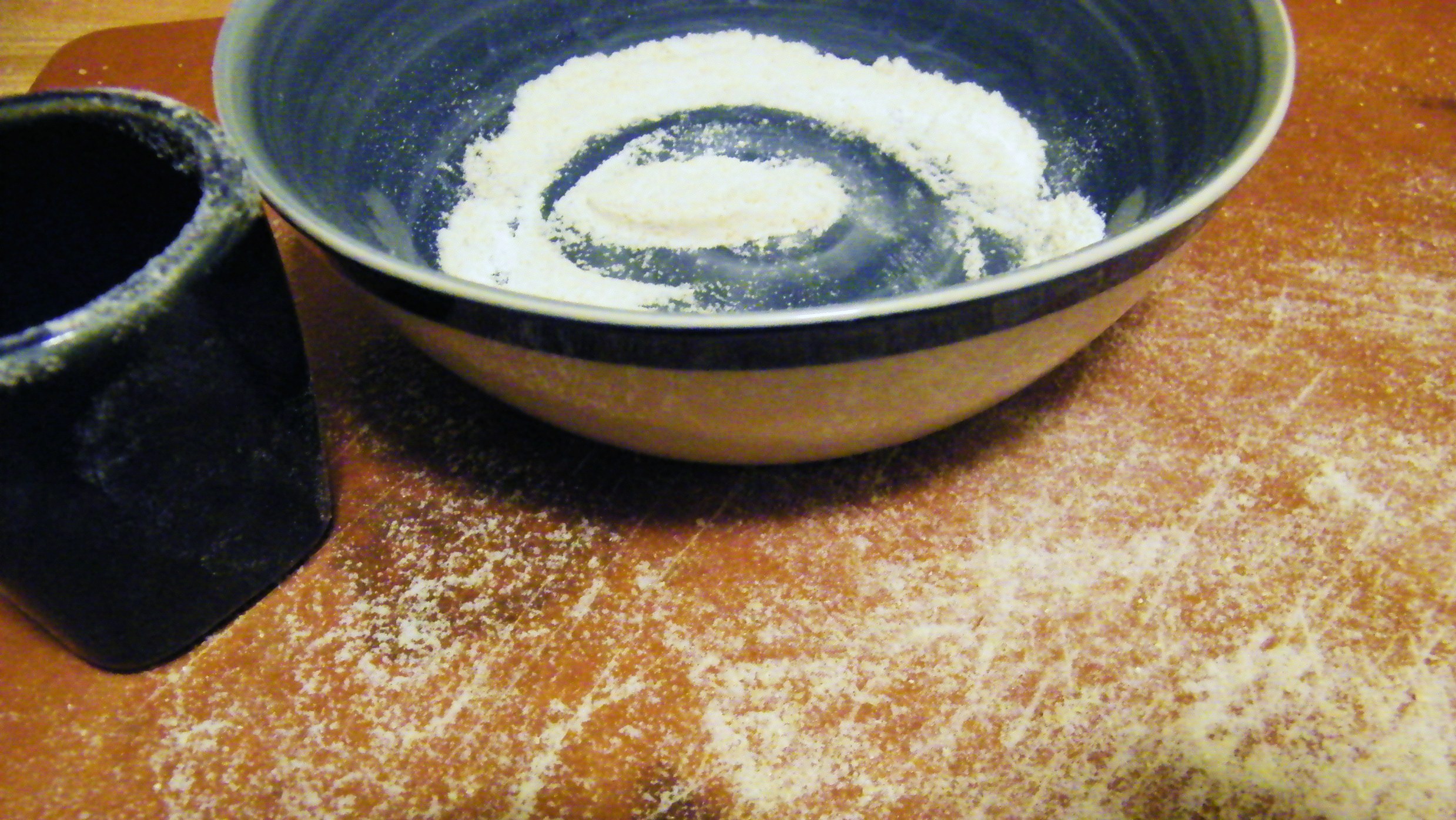 A floured board, a blue-and-white bowl with flour in it, and a Japanese tea cup subbing as a biscuit-cutter