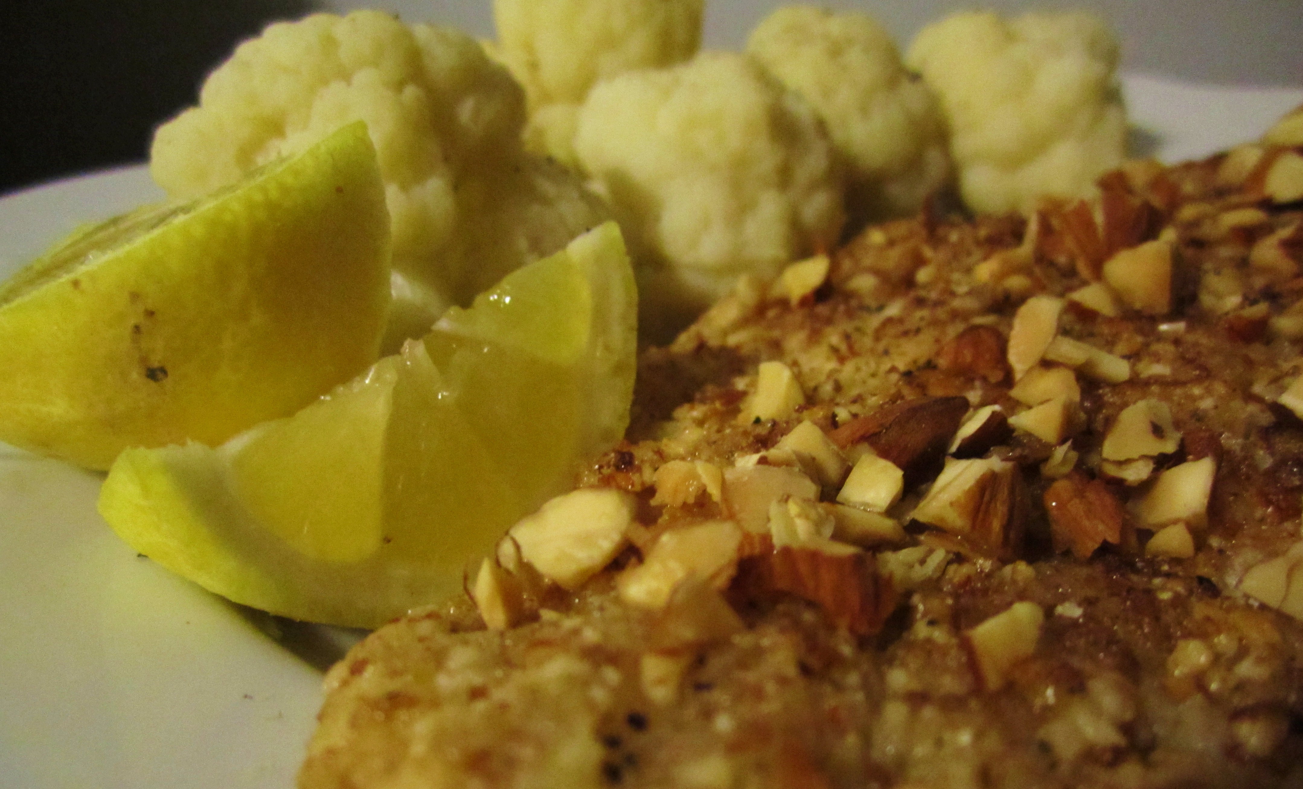 Sole, coated in an almond-lemon zest crust, with cauliflower and lemon wedges in the background.