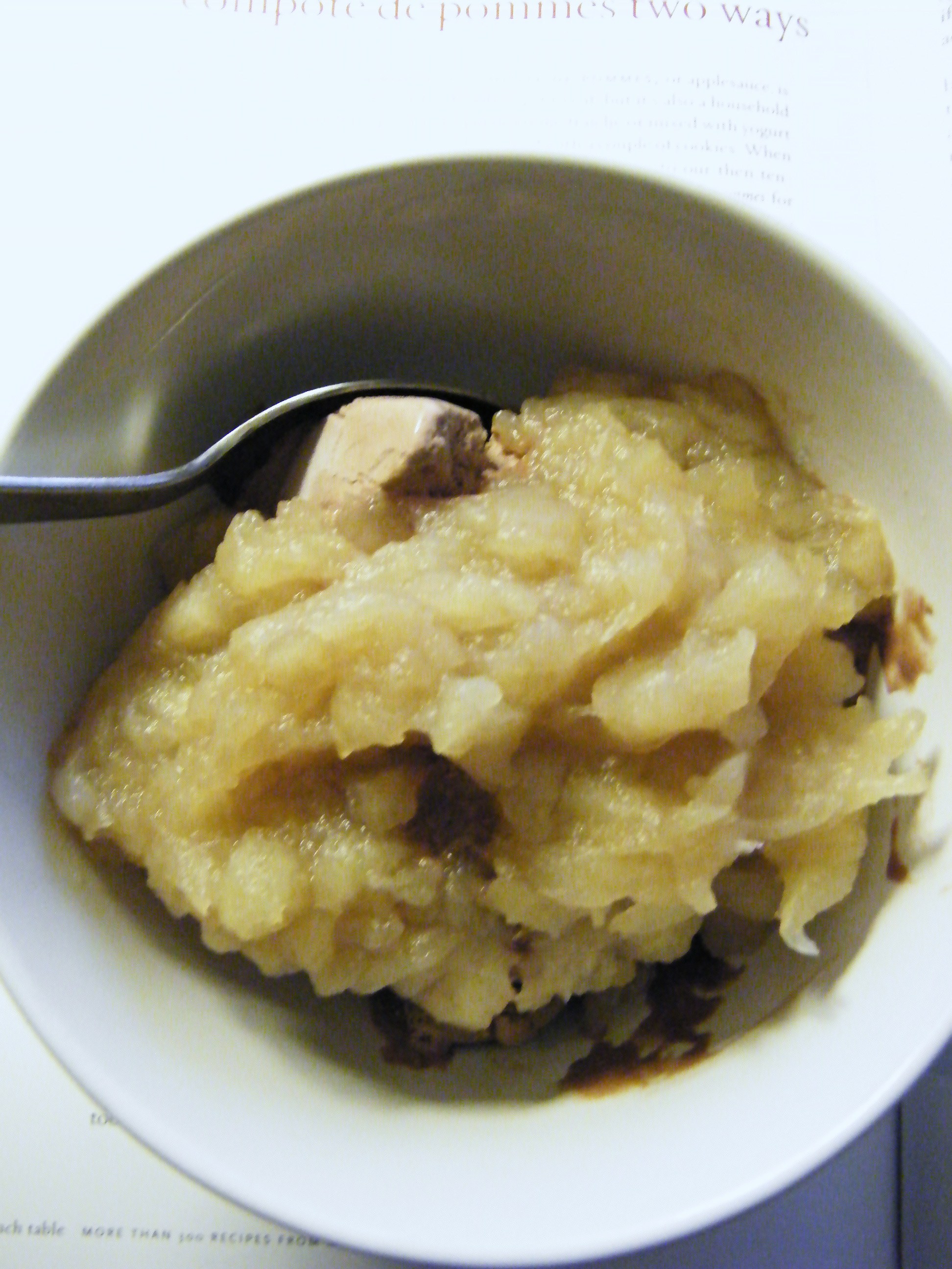 I made enough of this compote to enjoy of ice cream (or rather, Coconut Bliss) tonight, with lots left over to stir into yogurt tomorrow morning. Next time, I think I’ll make a bigger batch. I haven’t made an applesauce cake in far too long.