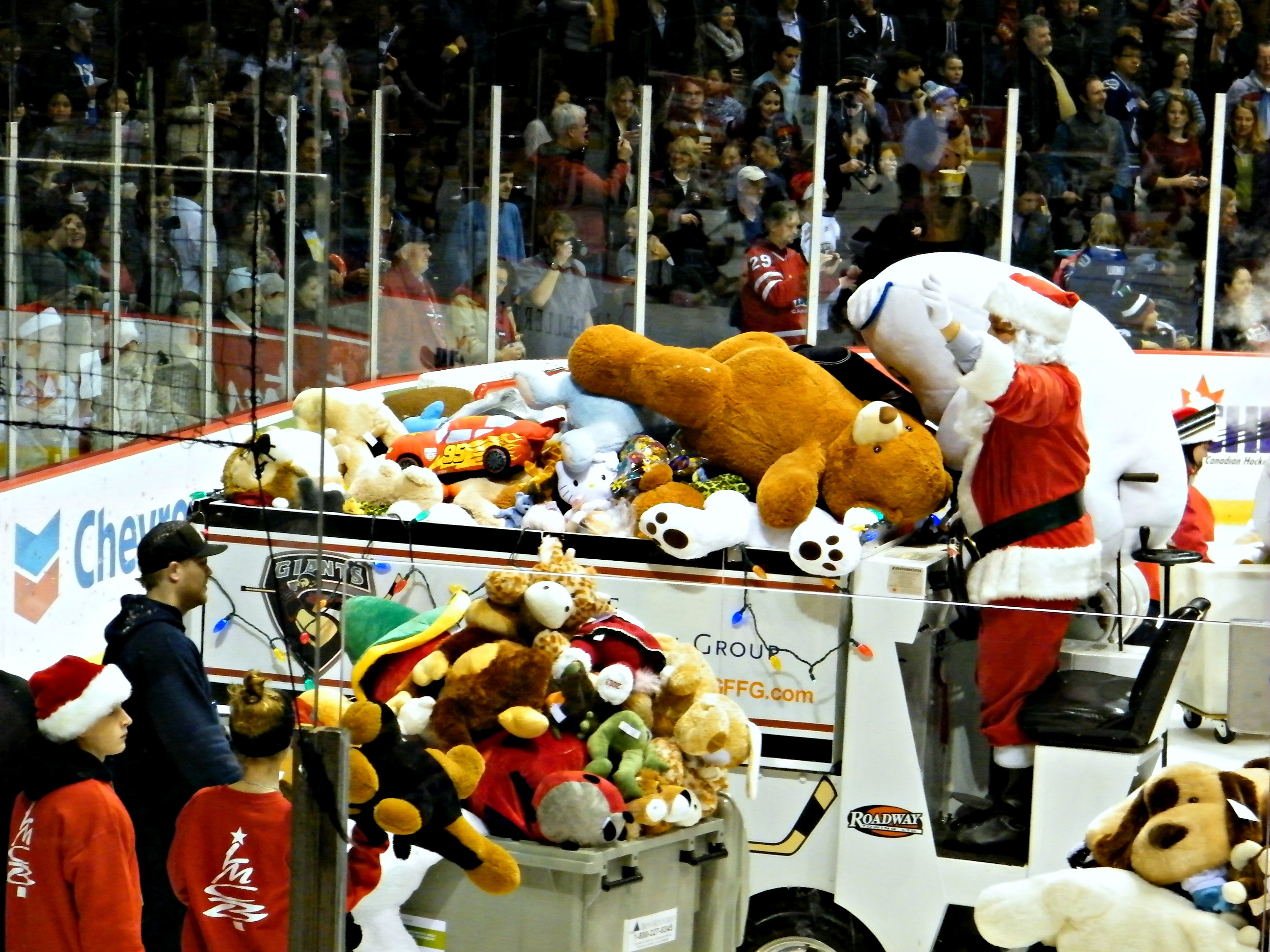 We’re entering the countdown to Christmas now, with a week to go. There’s still time, though, to do a little good while you’re finishing up your holiday preparations. I was thinking about this last weekend, when I attended the Vancouver Giants‘ Teddy Bear Toss night. As you can see, the Giants’ first goal caused a shower of generosity in the form of stuffed animals – more than 10,000 fans threw several hundred of them onto the ice. The toss benefits the Vancouver Province newspaper’s Empty Stocking Fund, the CKNW Orphans’ Fund, and the Lower Mainland Christmas Bureau. It was a feel good event, with stuffed animals flying through the air, a shutout win against one of the Giants’ toughest rivals, and a sense of giving back to the community permeating the happy, friendly crowd .