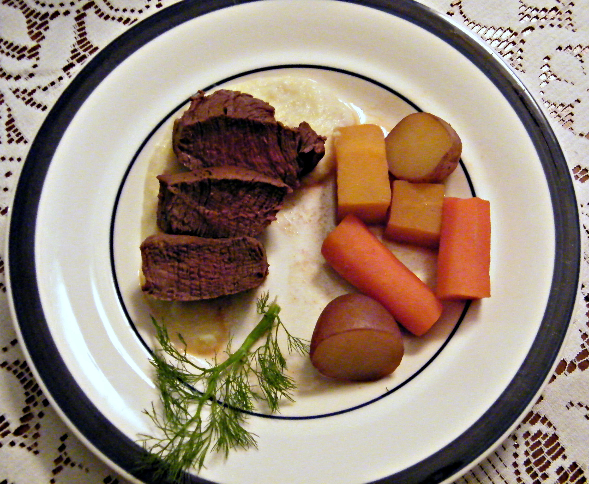 I served the moose and vegetables with this Garlic and Fennel Purée from Food and Wine. The garlic and fennel flavour was wonderful, but I prefer a heartier purée, like Dorie’s celery root purée. I think I’d rather use that recipe as a template for fennel purée, but keep the mountain of garlic from Food and Wine‘s version.