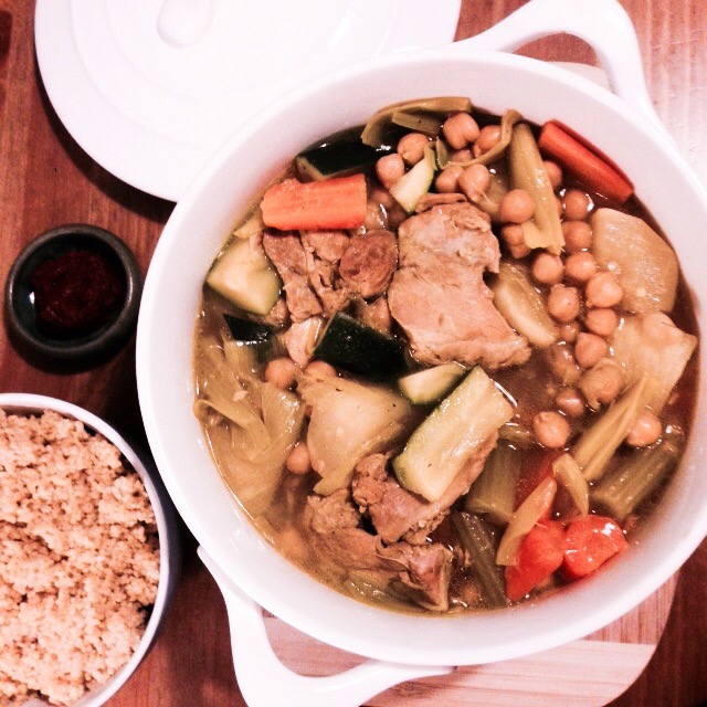 I used to make the same stew in vast quantities when I was one of the only ones in my university crowd who knew how to cook. It would keep us all going for a week, and when the chicken ran out, I’d sauté cubes of tofu in the same spices and add them to the pot. At the end of the week, if there was any broth left over, I’d use it as the base of a clean-out-the-fridge soup.
