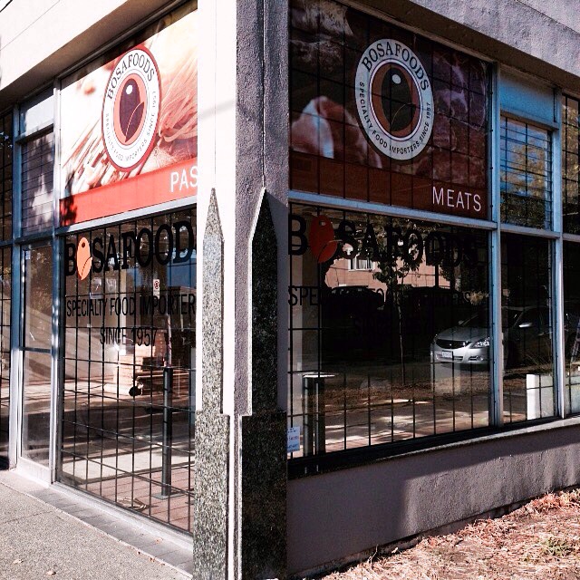You seemed to have noticed the new Bosa location while they rebuild the Bosa #1. But you might take a trip to Gravely Street and Kootenay just of Boundary Road, south of Charles Park to Bosa #2 with small café and a very large store (it is also their western Canada warehouse) at 1465 Kootenay St. They have much more stock there, with 4 aisles of pasta, a full meat market (formerly at one end of the Bosa #1 block),
