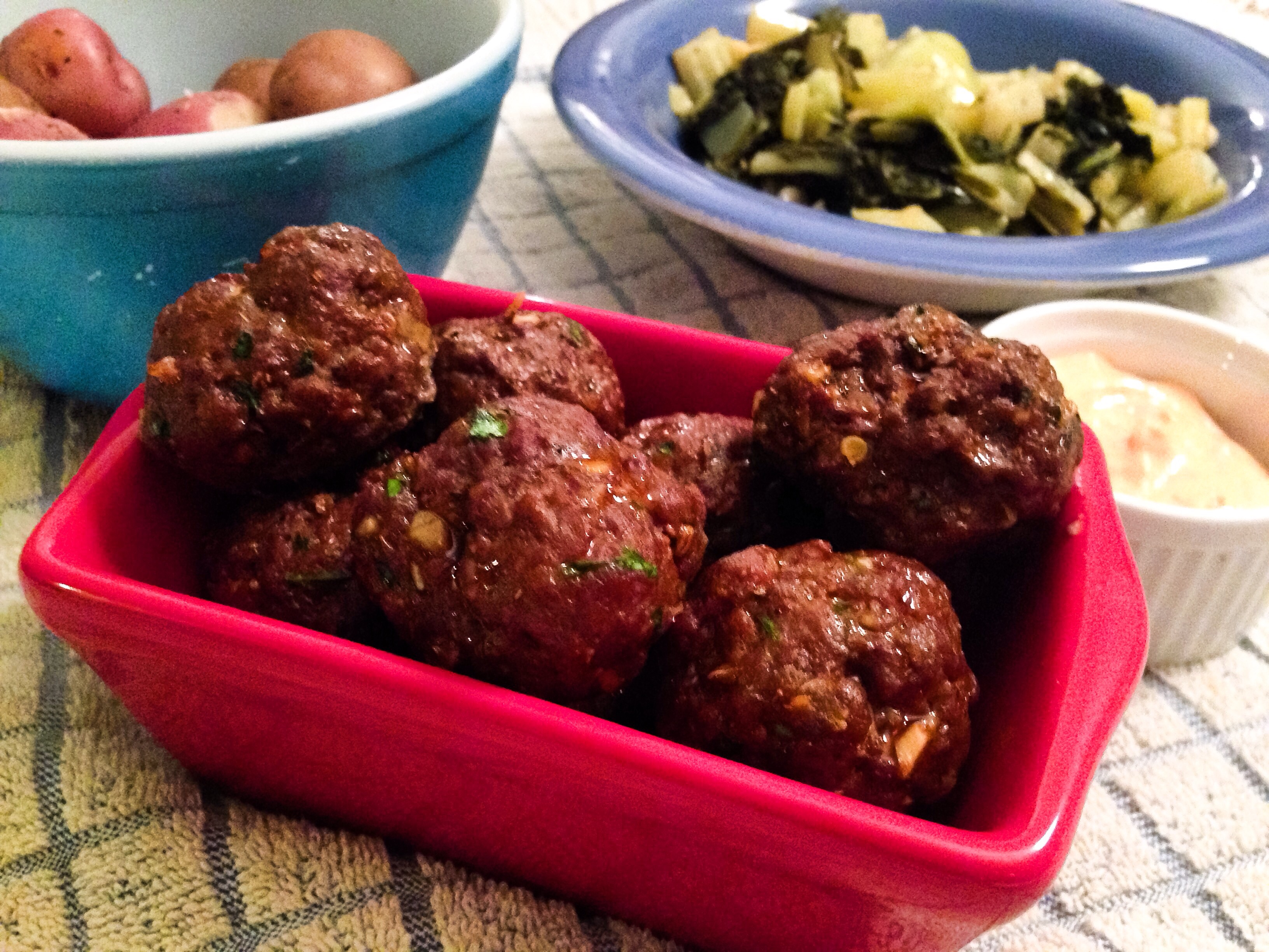 My Dad picked some Swiss chard and potatoes from the garden and prepared those while I worked on the meatballs. They’re meant to approximate merguez sausage, but we used sambal oelek in place of harissa, so they were more like merguez with a twist.