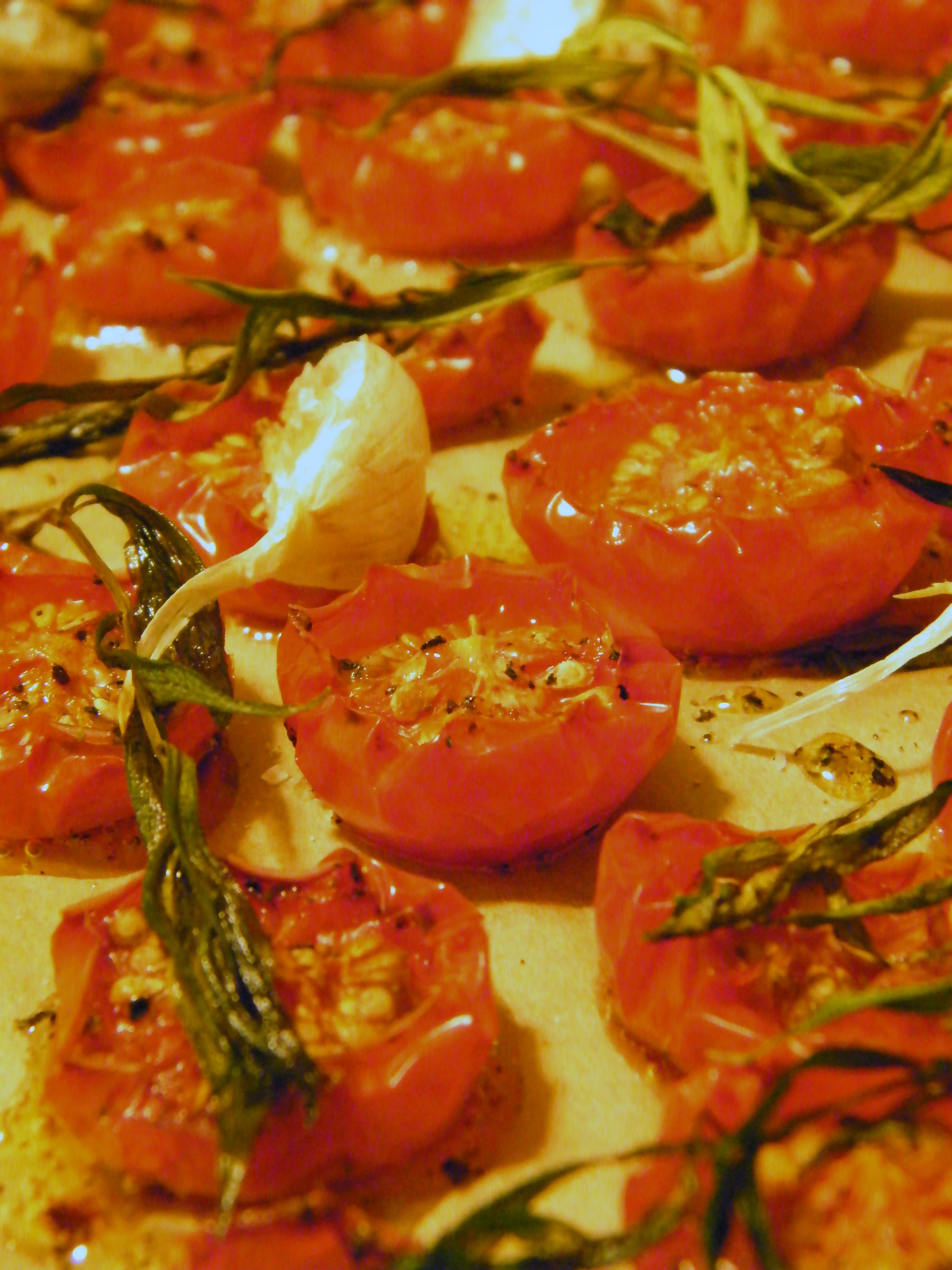 I’ve never been a fan of commercial roasted bell peppers – they’re usually a little slimy and the best part of the flavour is in the oil they’re packed in. Homemade roasted peppers, though, are an entirely different matter. Dorie’s recipe has you roasting the peppers in the oven, making it easy to cook them until they blacken and collapse. Once they’ve cooled down enough to peel, it’s just a matter of layering them with seasonings and marinating them in the fridge for at least a couple of hours. I made mine last night and they were wonderful as an appetizer. Unlike the ones out of a jar, they weren’t without texture and they certainly weren’t slimy. Instead, they had a light coating of good olive oil and they were covered in garlic and herbs. I also took a quarter cup of the oil and a slice of pepper, as Dorie suggests in her bonne idée, and made a vinaigrette. I used balsamic instead of sherry vinegar and it was a perfect dressing for salad this evening. Even better, there are still plenty of peppers in the fridge for me to work my way through Mary’s list of roasted pepper ideas.