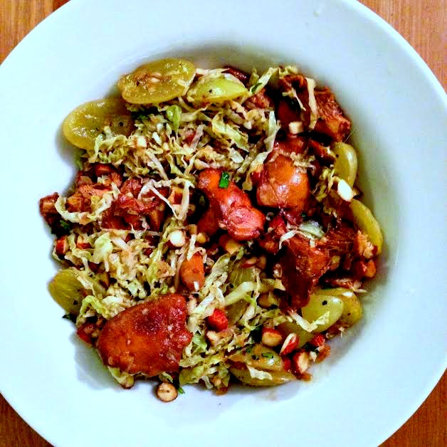 My better angel prevailed and here we are, with an appetizer that is sweet and savoury, meaty and vegetal, all at once. I made a small portion of the dish for the two of us to share, substituting savoy cabbage for the napa and using some vegetable stock in place of bouillon. I’d forgotten to pick up hazelnuts on the way home, so I used chopped almonds instead. I think they were as nice as hazelnuts would have been. I also took Dorie’s bonne idée and threw in some green grapes, which added another lovely layer of flavour to the dish.
