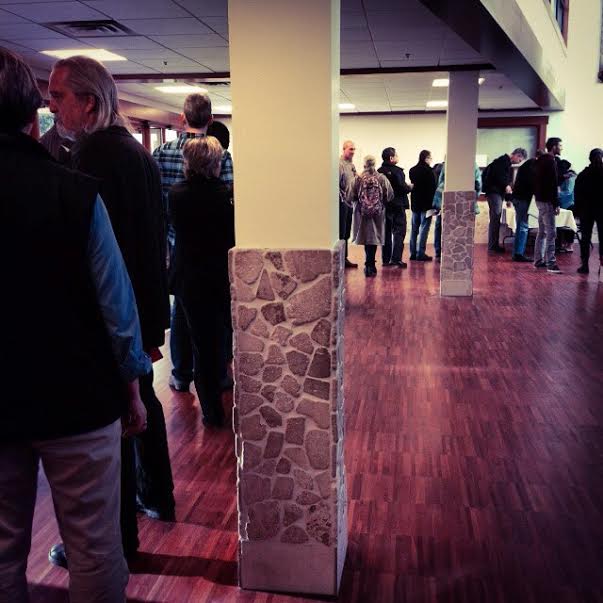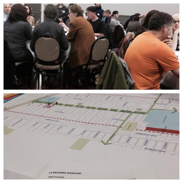I arrived shortly before seven and the line up of participants was nearly out the door, while inside, most of the tables were almost full. I managed to get a seat at one of the Britannia-Woodland discussion tables, then during the second round, sat at a Commercial Drive discussion table. People were still arriving as the discussion started and as with all of the meetings I’ve attended so far, there were enough participants to fill at least a half dozen more tables. As it was, people found space where they could, or sat two-deep for some of the more contentious discussions.